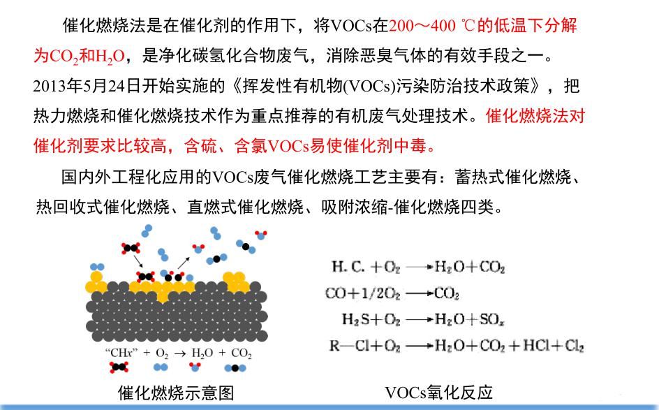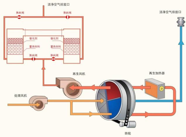 结合蓄热式氧化及触媒氧化,此项技术可降低RTO系统的温度,有效提高破坏效率及减少燃料的用量。RCO系统是以RTO的构造作为基础,在氧化炉中加上一层特殊的催化剂材料,利用催化剂氧化提供足够以破坏VOC所需的热能,以降低RTO系统的操作温度。RCO的装置与RTO的装置相类似,采用床式或旋转式设计,床内皆填充定量的蓄热陶瓷以进行替换来自工艺排放的热量。床体上方连接燃烧室并加上一层材料的催化剂在热交换与氧化室内之间。含VOCs的废气进入RCO系统时,会先在热交换室进行预热,约310℃左右,然后通过催化剂后进入氧化燃烧室进行氧化,氧化完成的气流离开氧化室后进入另一个热交换室,在这个热交换室中,干净的气流会将含有的热能释出,即可排放到大气中。RCO的热回收与RTO相似。